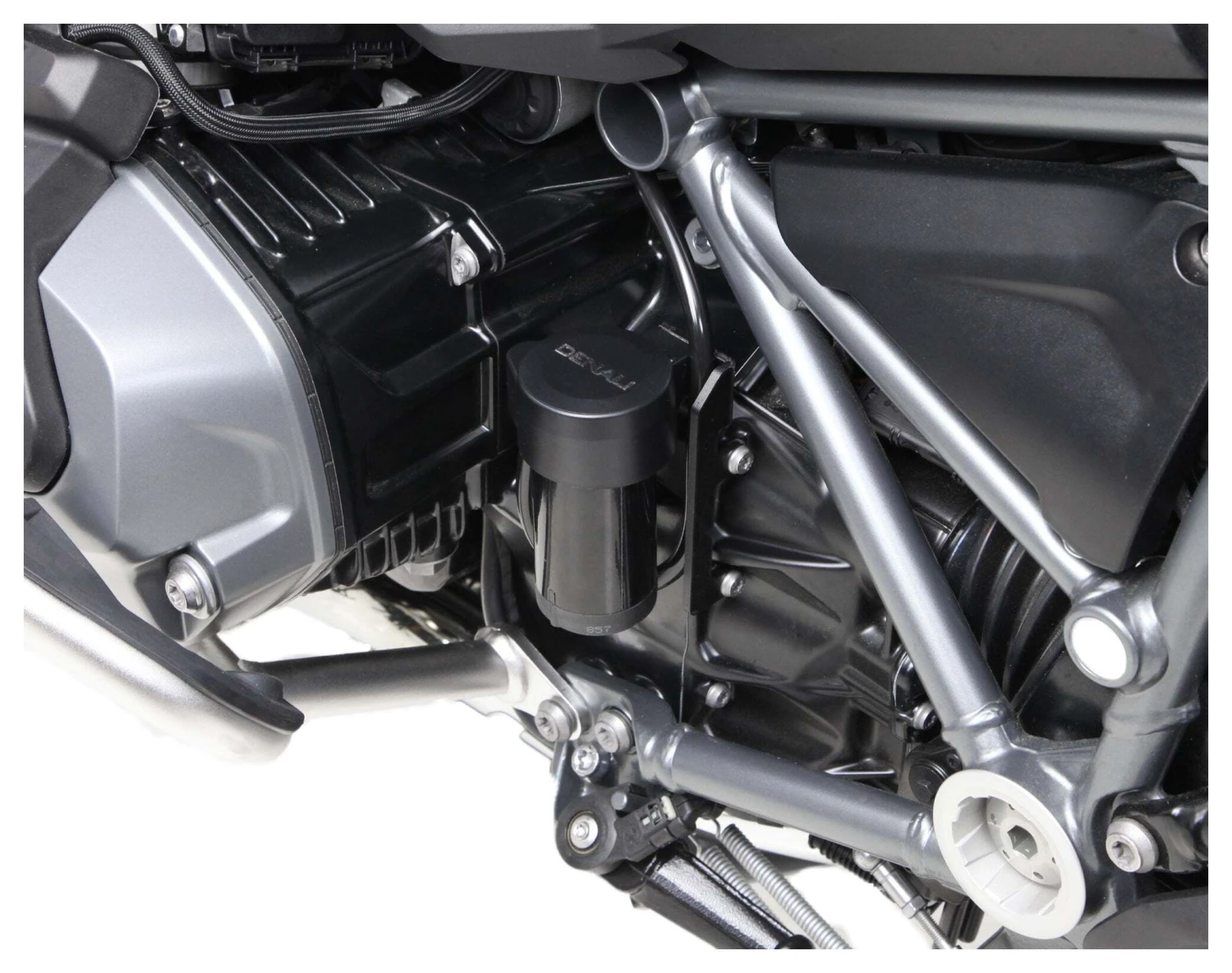 This vehicle specific split horn mount allows you to mount the Denali SoundBomb Split Dual-Tone Air Horn in the optimum location on your BMW R1200GS/GSA or R1250GS/GSA. This kit includes one powder-coated steel bracket to mount the horn compressor behind the cylinder head and a second bracket to mount the horn acoustic unit centered under the fairing stay.Â