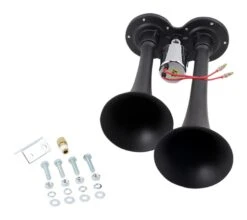 Dual truck horn, two zinc alloy trumpets 6.5″ and 8.5″ in length. Kleinn’s compact air horns can fit in almost any vehicle and deliver the big sound you need. Easy to fit, and extreme high pitch horn sound.
