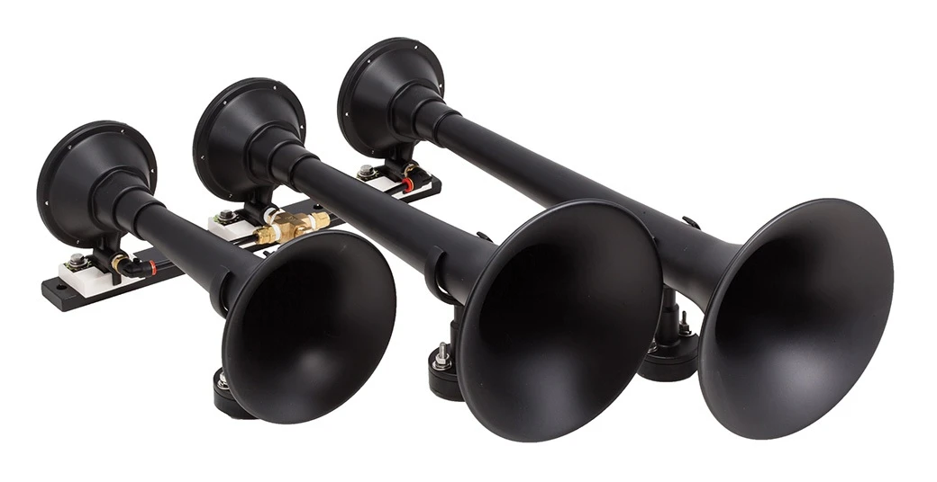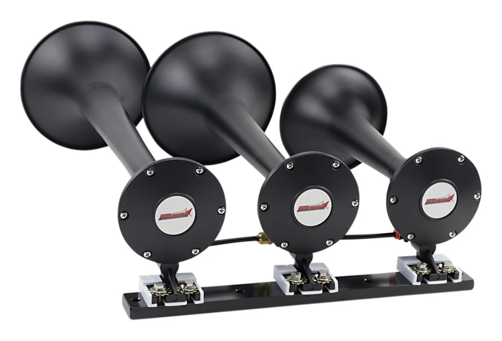 The Demon Model 730 features flat rack detachable design, spun steel trumpets (18.25”, 14.75”, 10.5”) & extreme flow, heavy duty brass solenoid valve. This is the loudest, largest and most aggressive train horn on the market, bar none. XCR 2.0-coated black coating ensures that they’ll withstand heat, sun, UV & salt spray. Fully upgradeable with Kleinn’s Ultra BlastMaster for a truly earth-shaking experience (sold separately).