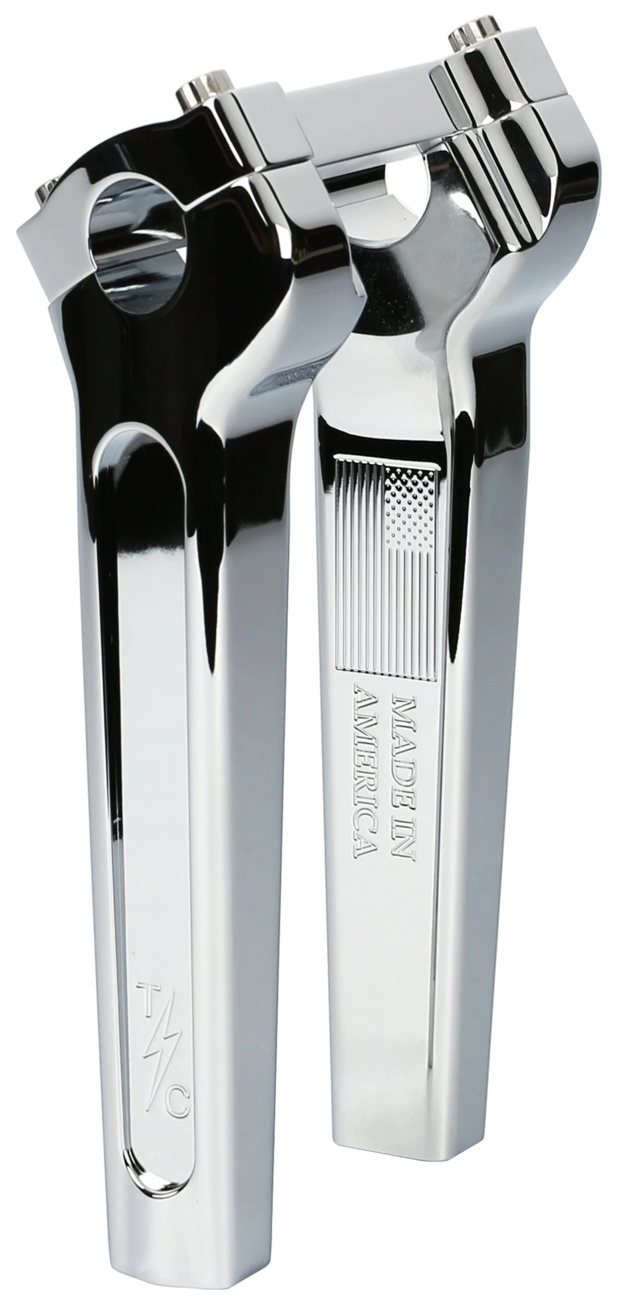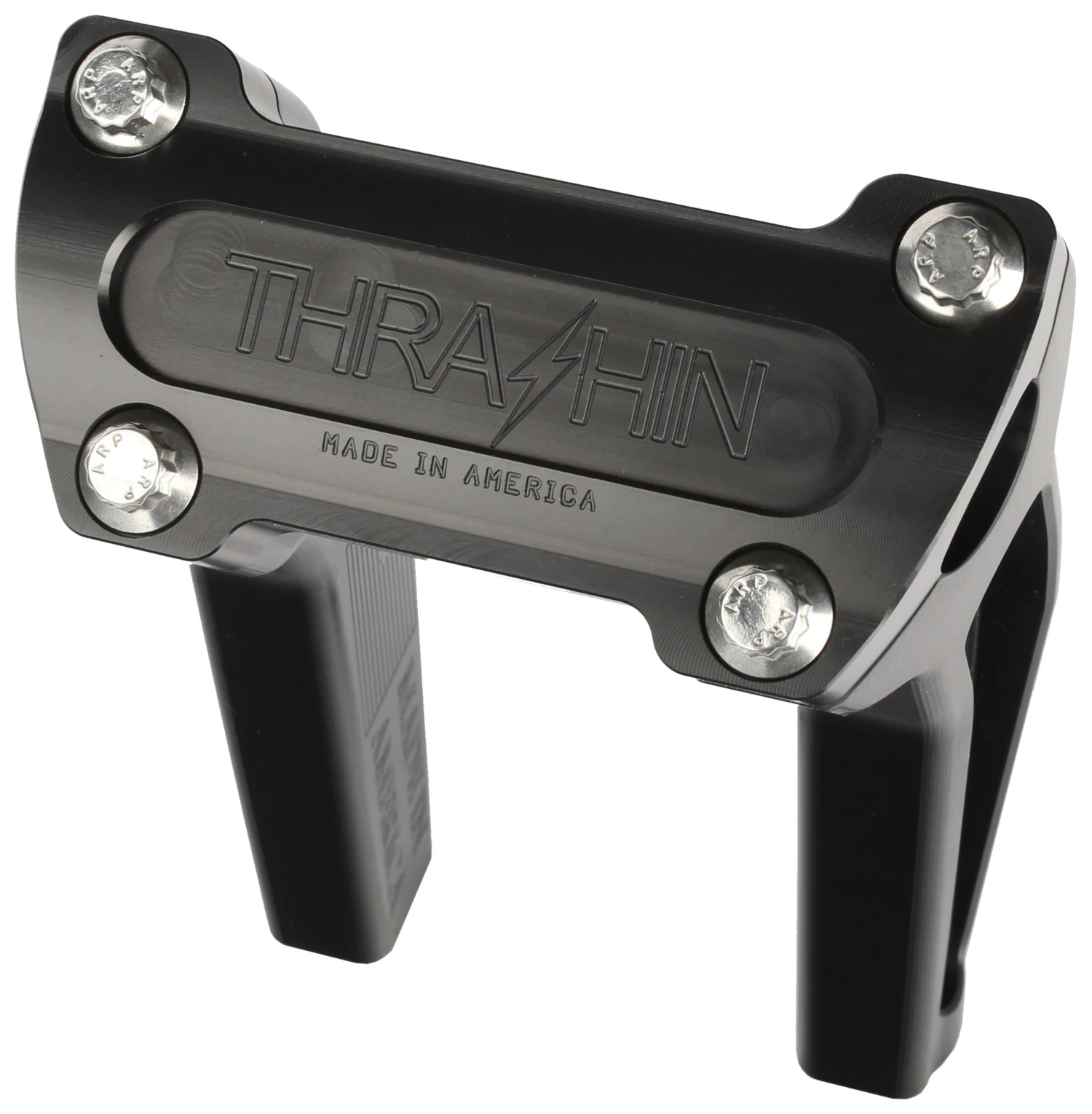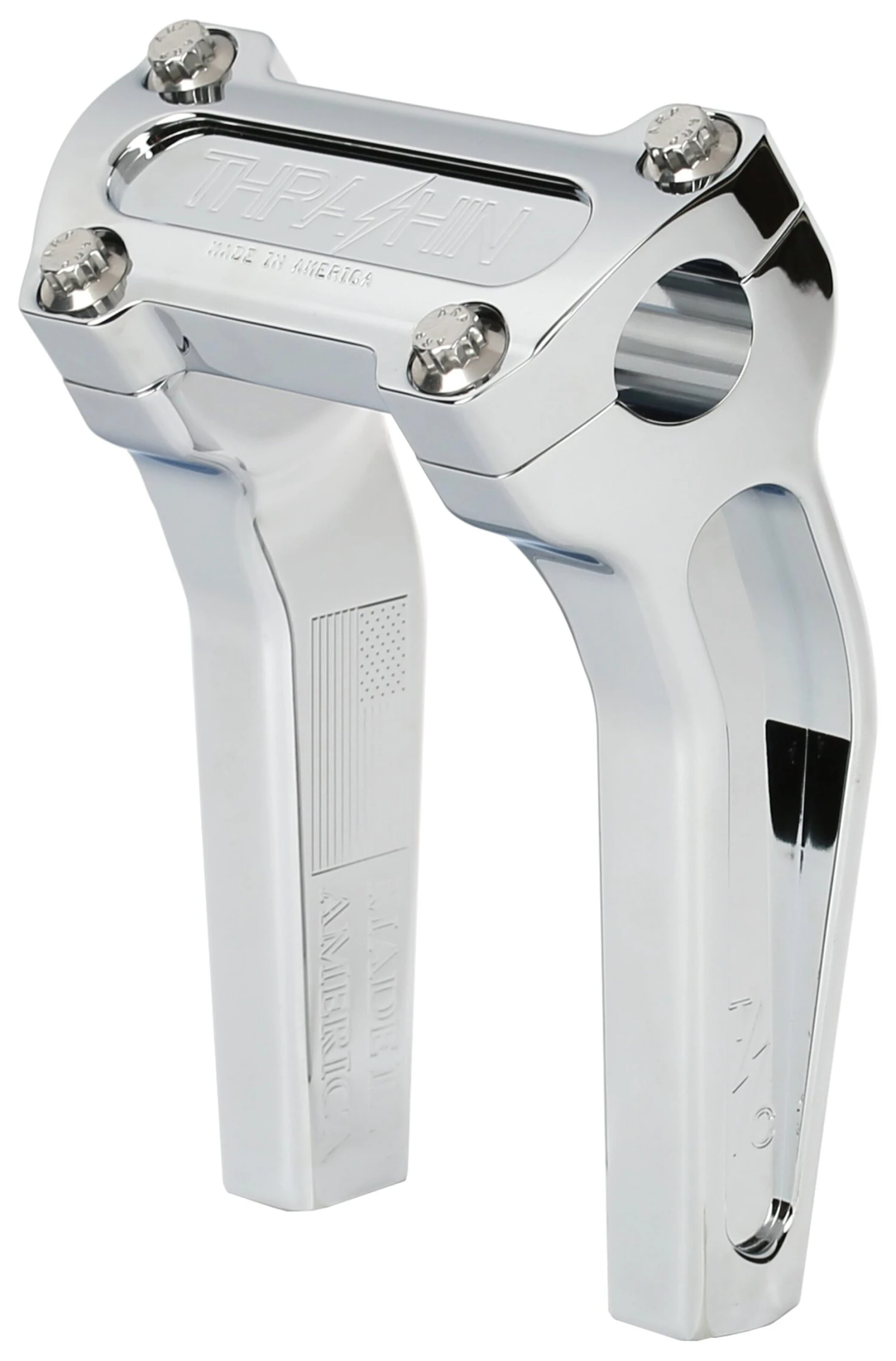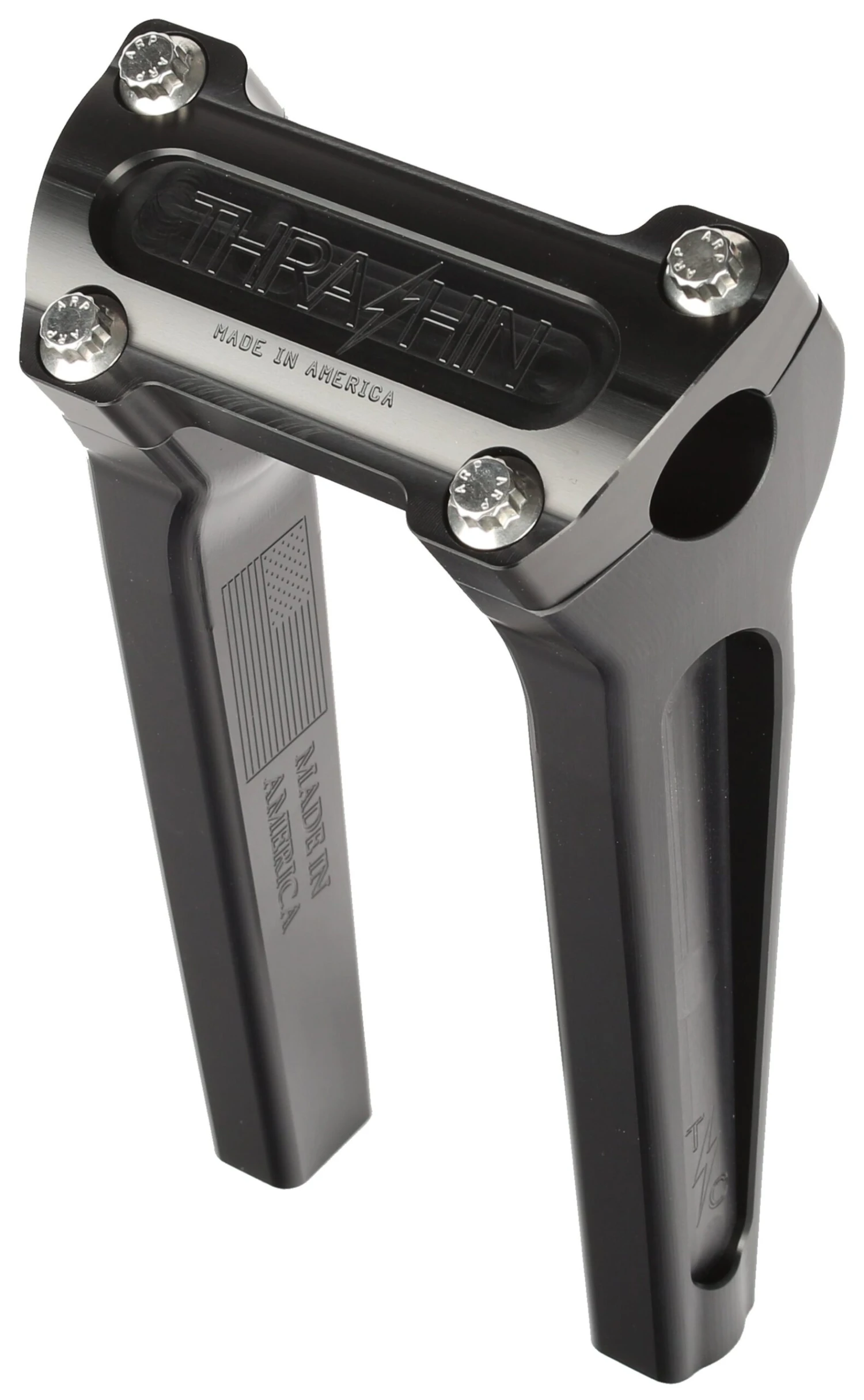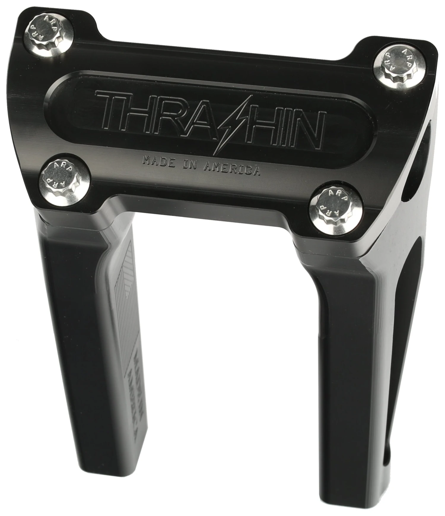 Be proud of what you put on your bike. Thrashin Supply Co. strives to build the best parts, without cutting corners, right here in the United States of America. Thrashin Supply Risers are made of Domestic 6061 aluminum and paired with ARP hardware. The black finish is a hard anodized black with an anti-fade agent added while the chrome finish is triple nickel plated (known as triple chrome) to withstand severe weather conditions, so your risers stay looking fresh for years to come. Top clamps are angled at 35 degrees whether you choose a pull back or straight riser. This gives the risers a stylish look and feel!